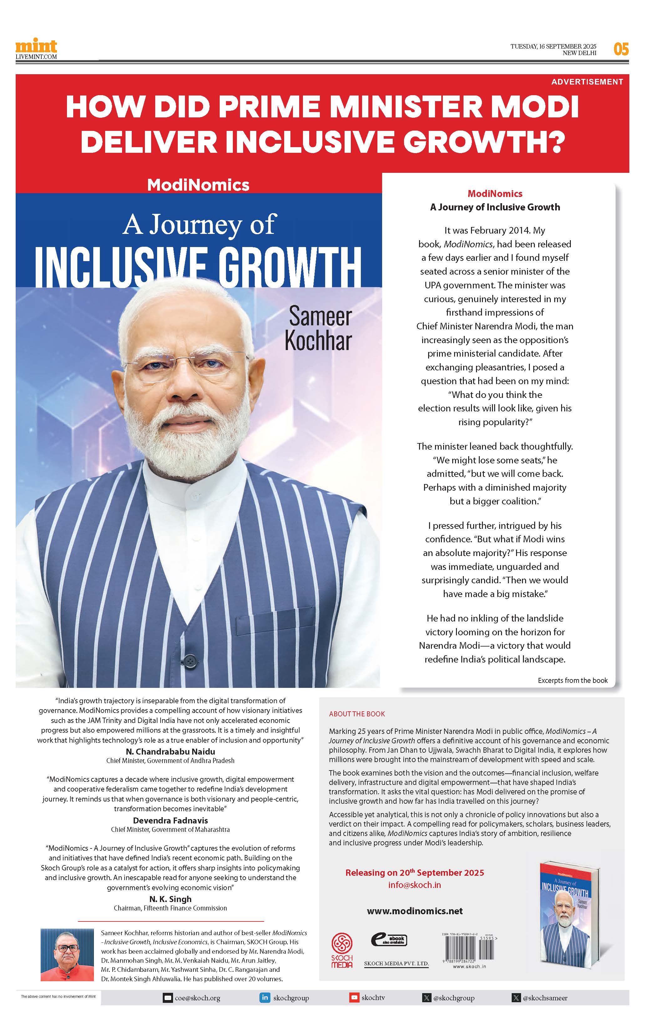 Summary: Mr Sameer Kochhar reflected on his journey as a reforms historian and the evolution of Modinomics, tracing its roots to 2013 when he first coined the term. He highlighted Prime Minister Modi’s focus on combining economic and governance reforms to ensure inclusive growth through initiatives like Jan Dhan, Mudra Yojana, Digital India, and DBT. Kochhar shared his writings documenting this transformation, emphasizing job creation, livelihoods, and improved quality of life as central to Modi’s 25 years in public service. His latest book, Modinomics: Journey of Inclusive Growth, compiles these insights and real-life stories of impact.*