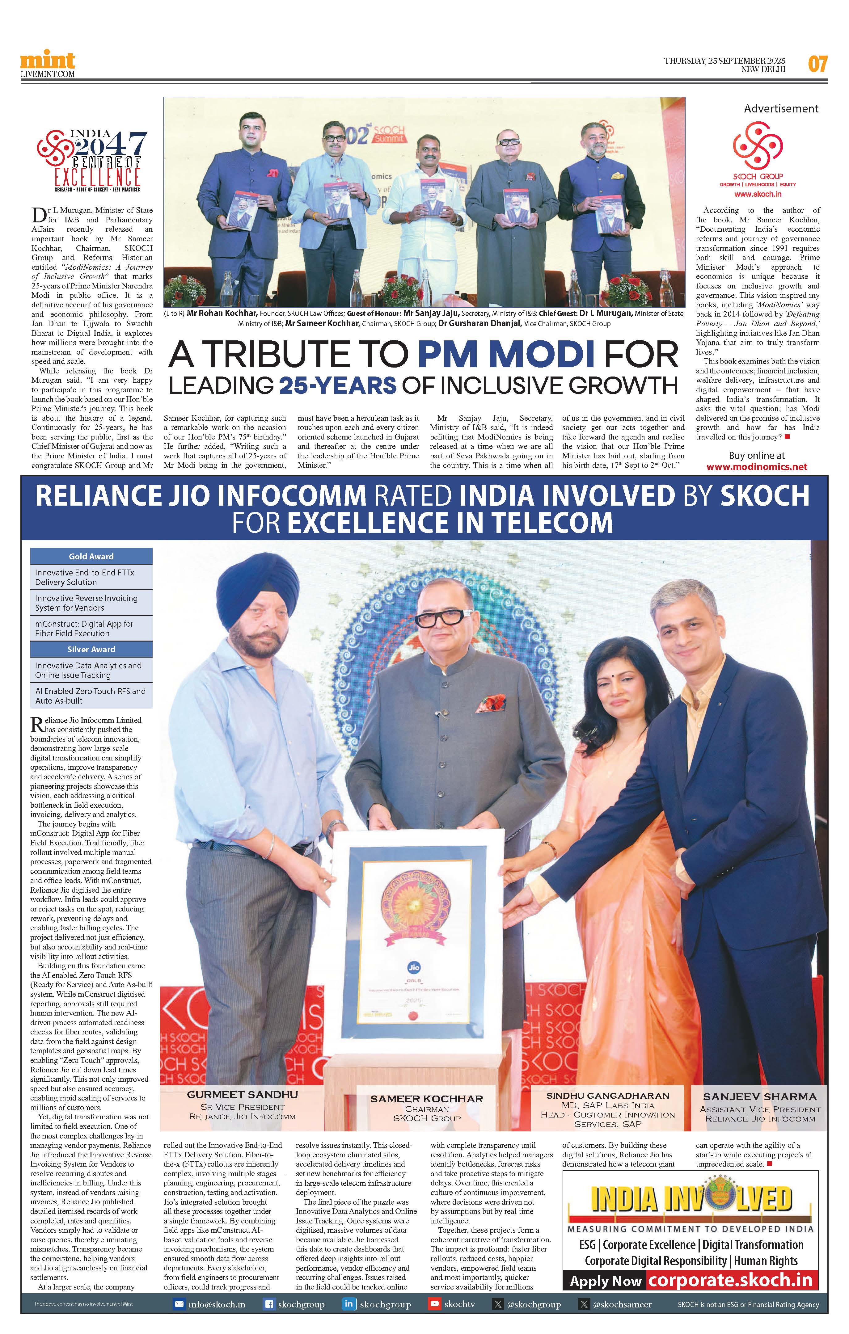 “ModiNomics - A Journey of Inclusive Growth” captures the evolution of reforms and initiatives that have de ned India’s recent economic path. Building on the SKOCH Group’s role as a catalyst for action, it o ers sharp insights into policymaking and inclusive growth. An inescapable read for anyone seeking to understand the government’s evolving economic vision”